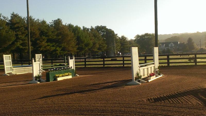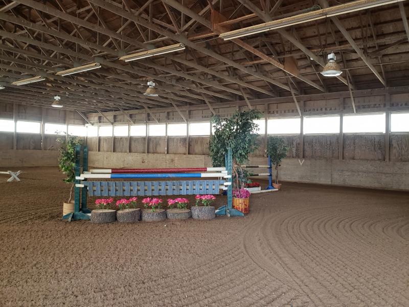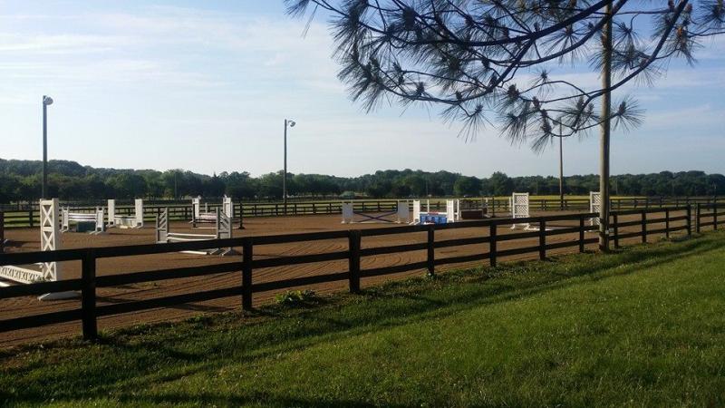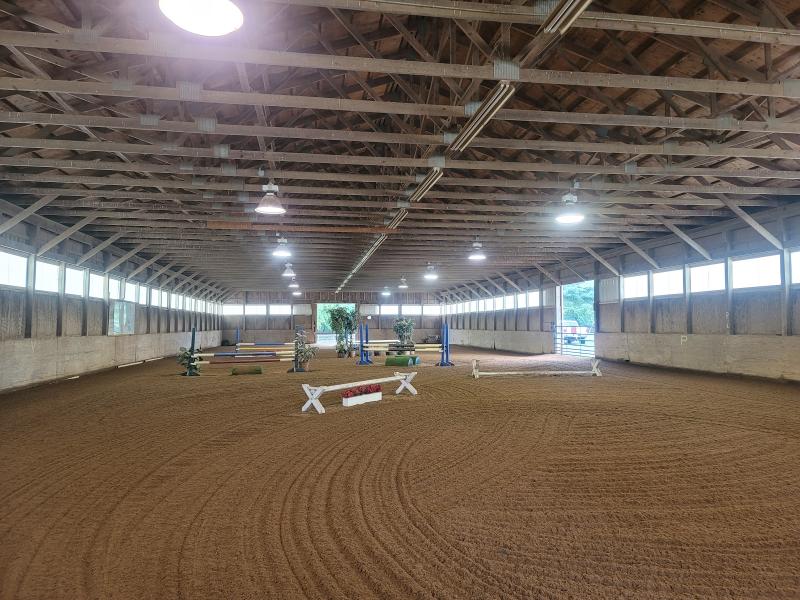 The full service facility offers a lovely outdoor ring (135 x 270) with jumps and lights, indoor ring with sand/fiber footing, cross country jumps, bridle paths for hacking, large fields for group turnout as well as private and semi-private paddocks.