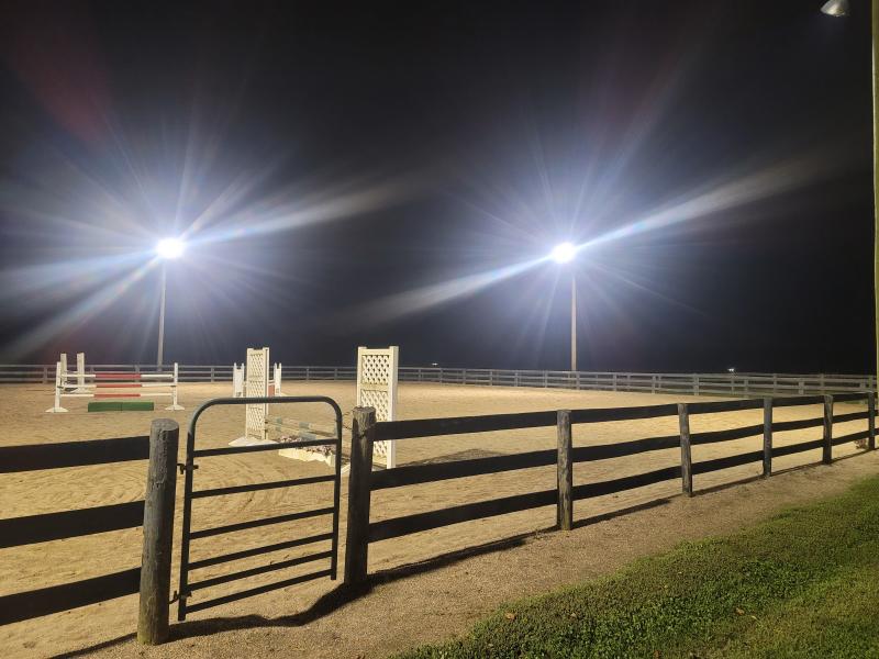 Our outdoor ring consists of sand footing and jumps. The rings lights are "stadium" style which provides ample brightness.
