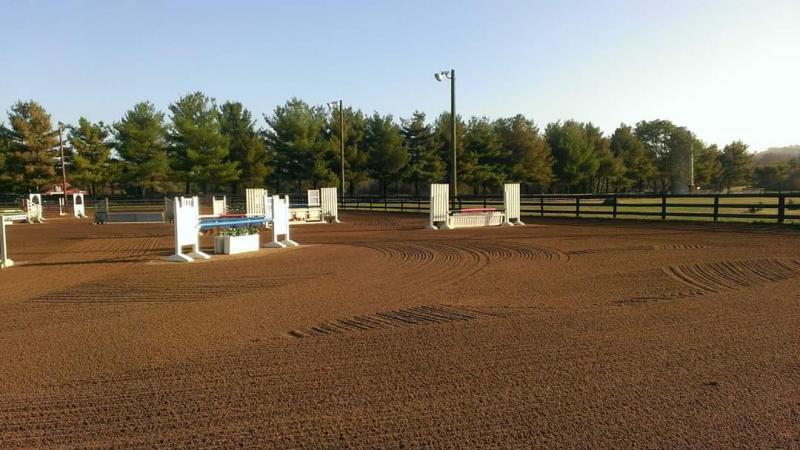 The full service facility offers a lovely outdoor ring (135 x 270) with jumps and lights, indoor ring with sand/fiber footing, cross country jumps, bridle paths for hacking, large fields for group turnout as well as private and semi-private paddocks.